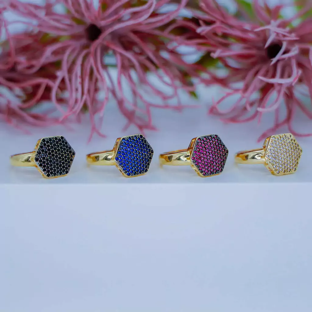 Descubra a beleza do anel hexagonal cravejado, uma verdadeira inspiração de joia que traz um toque de luxo e sofisticação ao seu visual. Este modelo exclusivo é ideal para quem aprecia a elegância das formas geométricas e a modernidade das semijoias.