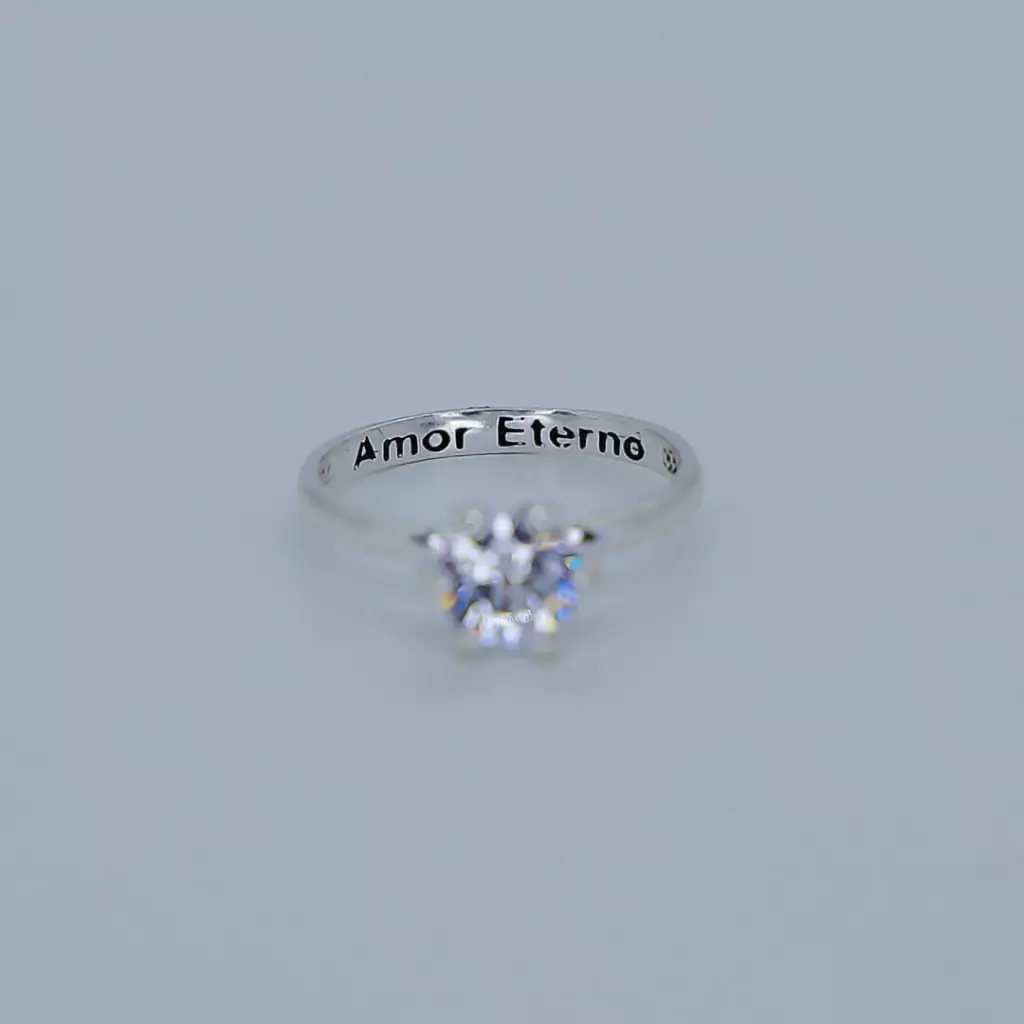 Desperte emoções com o Anel Solitário Amor Eterno. Esta deslumbrante joia é feita em prata 925 e apresenta a frase "amor eterno" elegantemente escrita ao redor do aro, simbolizando um compromisso duradouro.