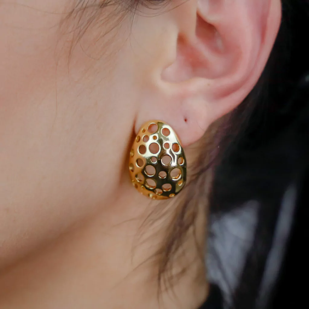Brinco Oval Vazado - 29939 Adorne sua beleza com o Brinco Oval Vazado - 29939, uma joia que combina delicadeza e sofisticação. Com seu formato oval e furos vazados, esta peça é atemporal e traz um toque orgânico que destaca a sua elegância.