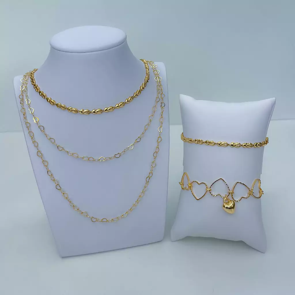 Surpreenda-se com a Composição Corações, uma seleção encantadora que traz duas pulseiras e duas chokers super versáteis, perfeitas para qualquer ocasião. Banhadas a 10 milésimos de ouro 18k, essas peças não apenas brilham, mas também oferecem um toque de sofisticação ao seu visual.
