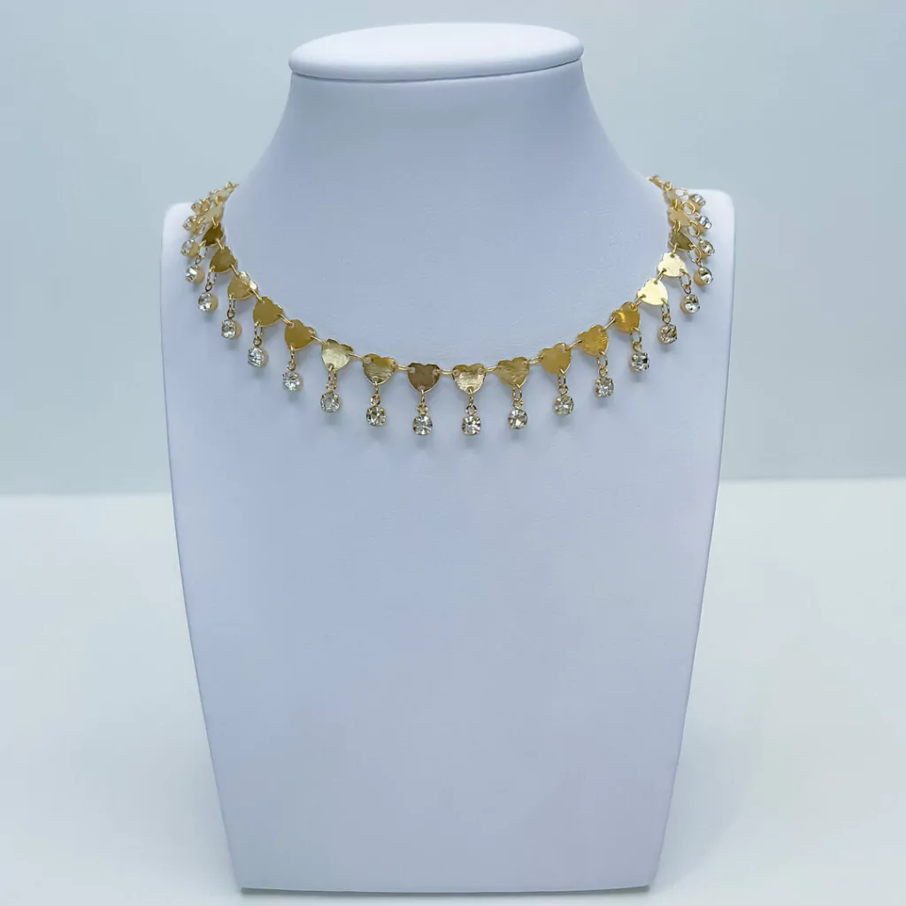 Encante-se com a composição rica em detalhes, que traz um choker com coração e pedras penduradas, oferecendo um charme irresistível ao seu visual. Essa peça é perfeita para adicionar um toque especial a qualquer look, seja para uma ocasião festiva ou para o dia a dia.