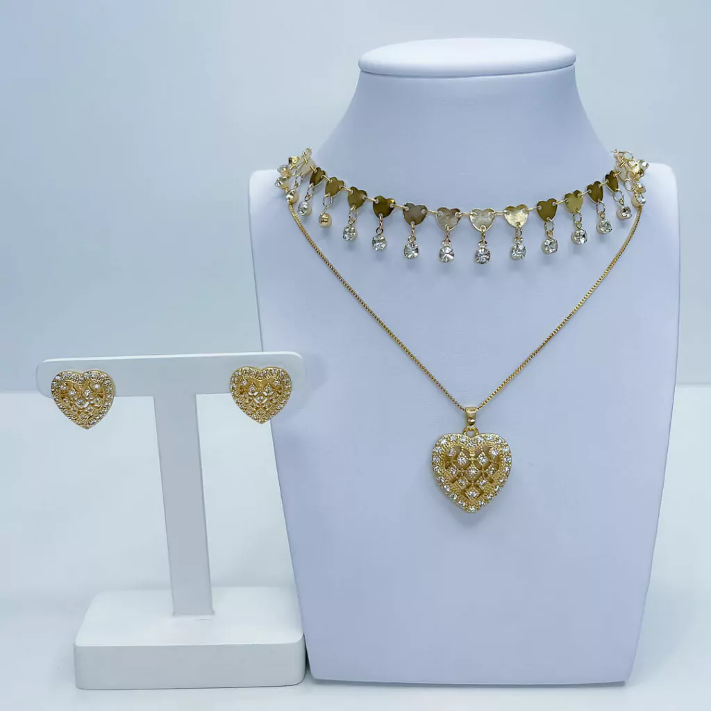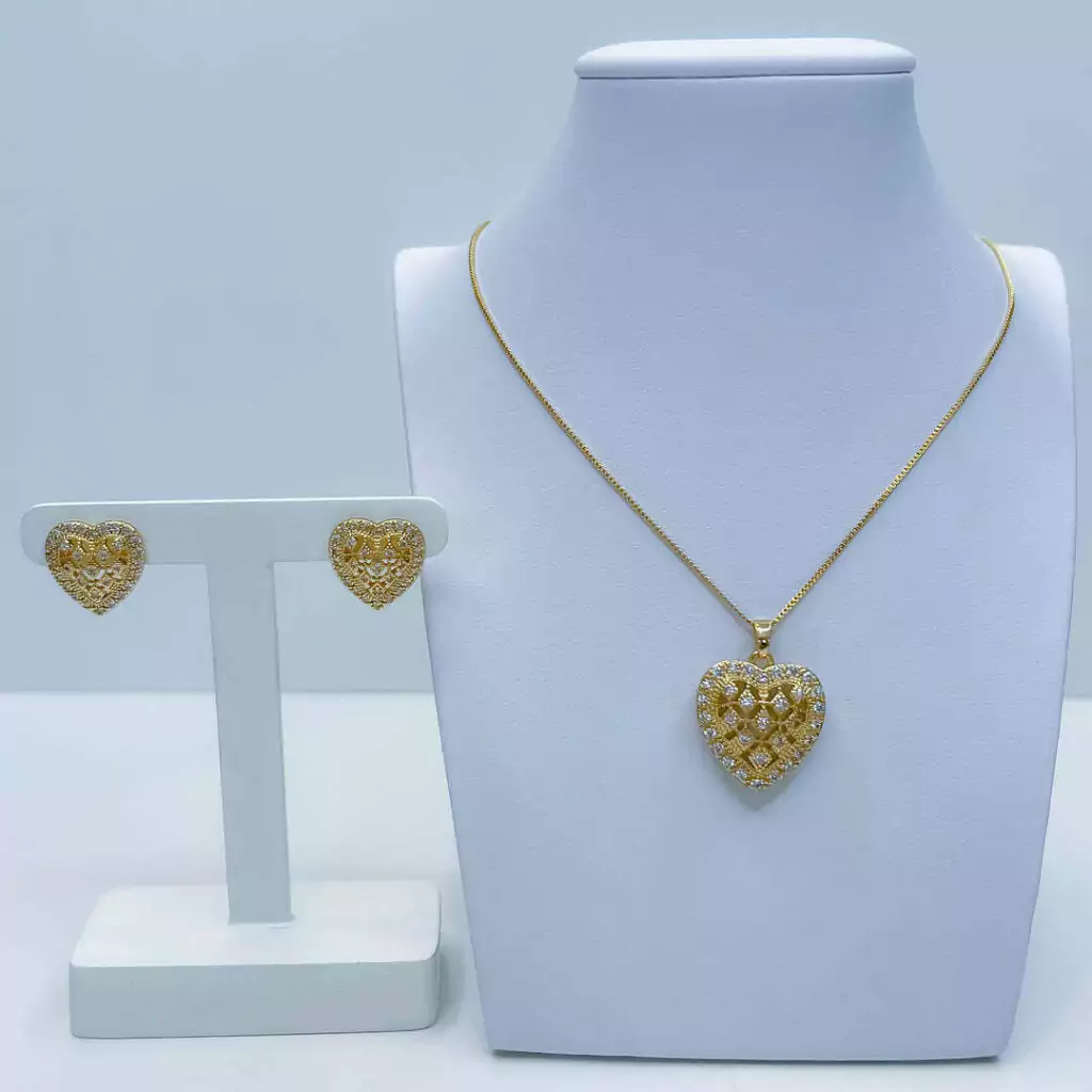 O conjunto coração apresenta um detalhe em cravejamento em zircônia, que brilha intensamente sob a luz, garantindo que você se destaque. Com uma corrente de 45 cm, é ideal para ser usado em camadas ou sozinho, sempre com elegância.