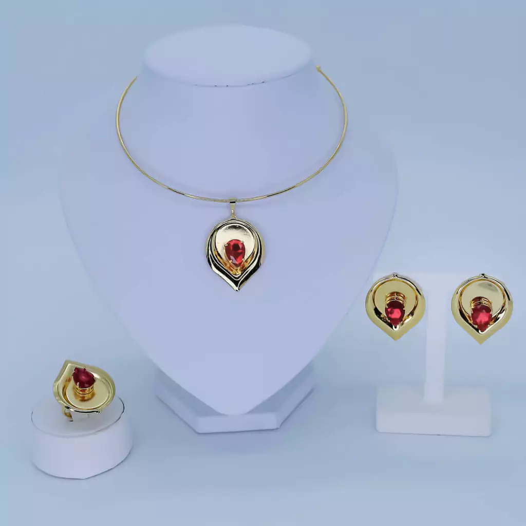 Aro + brinco gota com pedra vermelha, um conjunto maravilhoso e bem marcante. Para fazer a composição colocamos uma inspiração junto com o anel do mesmo modelo do conjunto. Peças banhada a ouro 18 k com 10 milésimos e com garantia de 1 ano.
