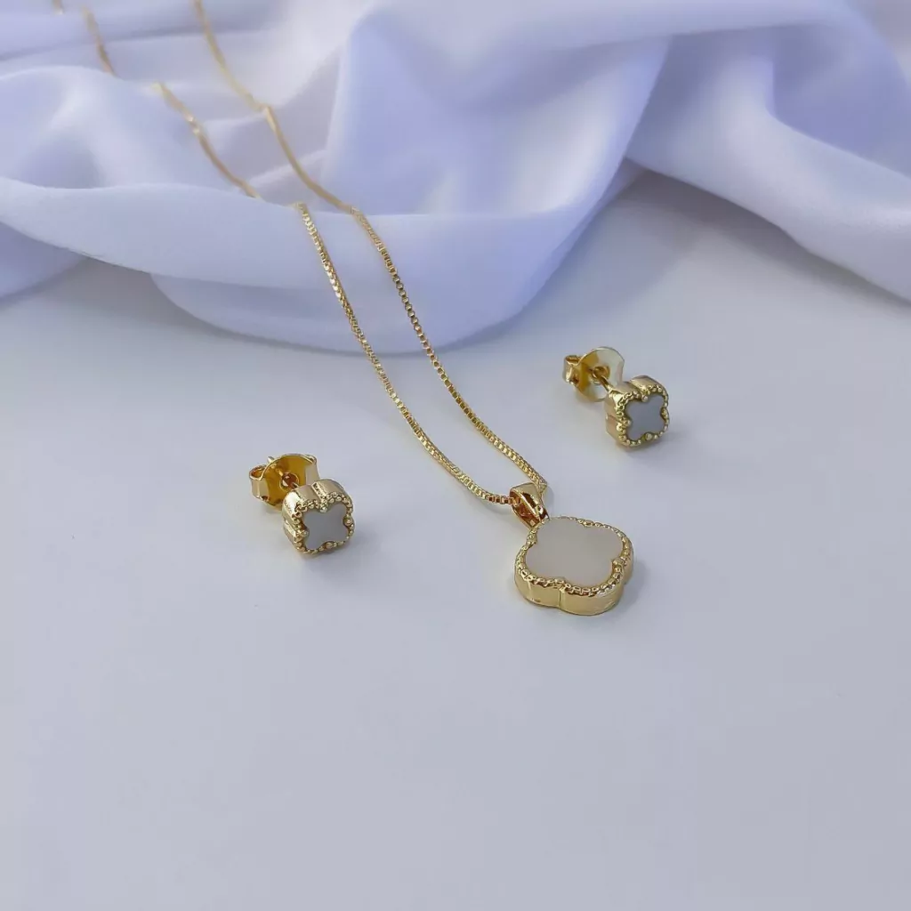 Conjunto de inspiração Van Cleef apresenta um design elegante composto por uma gargantilha de 45cm e brincos. Banhado a 10 milésimos em ouro 18k, é uma peça de qualidade com garantia de 1 ano na folheação. Garanta um visual sofisticado e moderno com este conjunto.