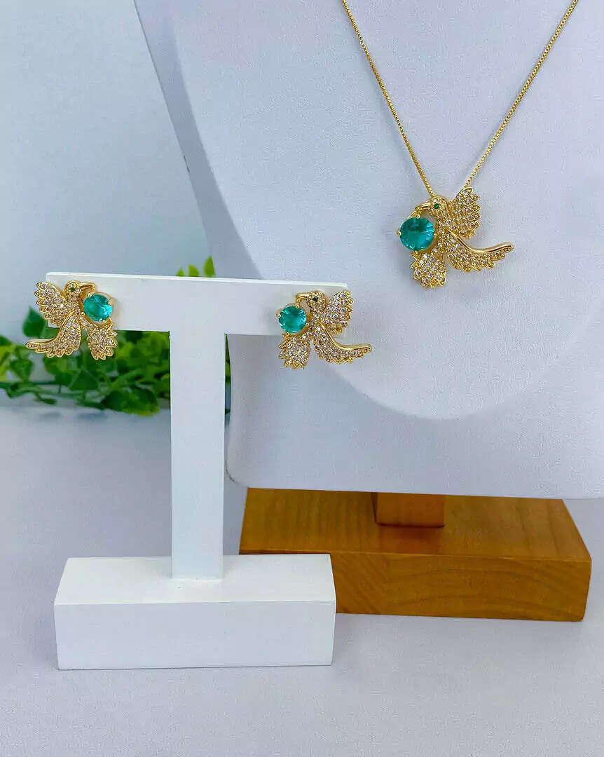 Conjunto pássaro cravejado com zircônia cristal, tamanho 45cm banhada a ouro 18k com 10 milésimos, com 1 ano de garantia.
